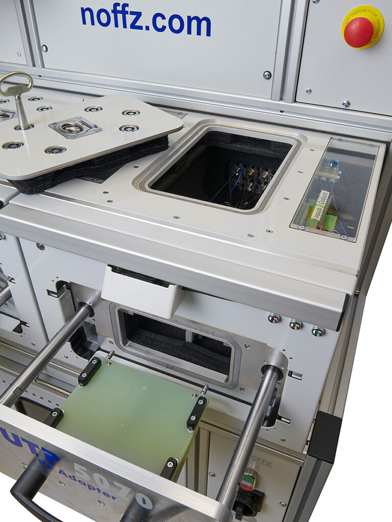 Die Ansteuerung der integrierten HF-Kammer erfolgt in diesem Video automatisiert mit Hilfe eines kollaborierenden Roboterarms. Er übernimmt das Öffnen und Schließen der Schublade sowie das Einlegen und Entnehmen der Telematik-Steuereinheit (Telematic Control Unit).