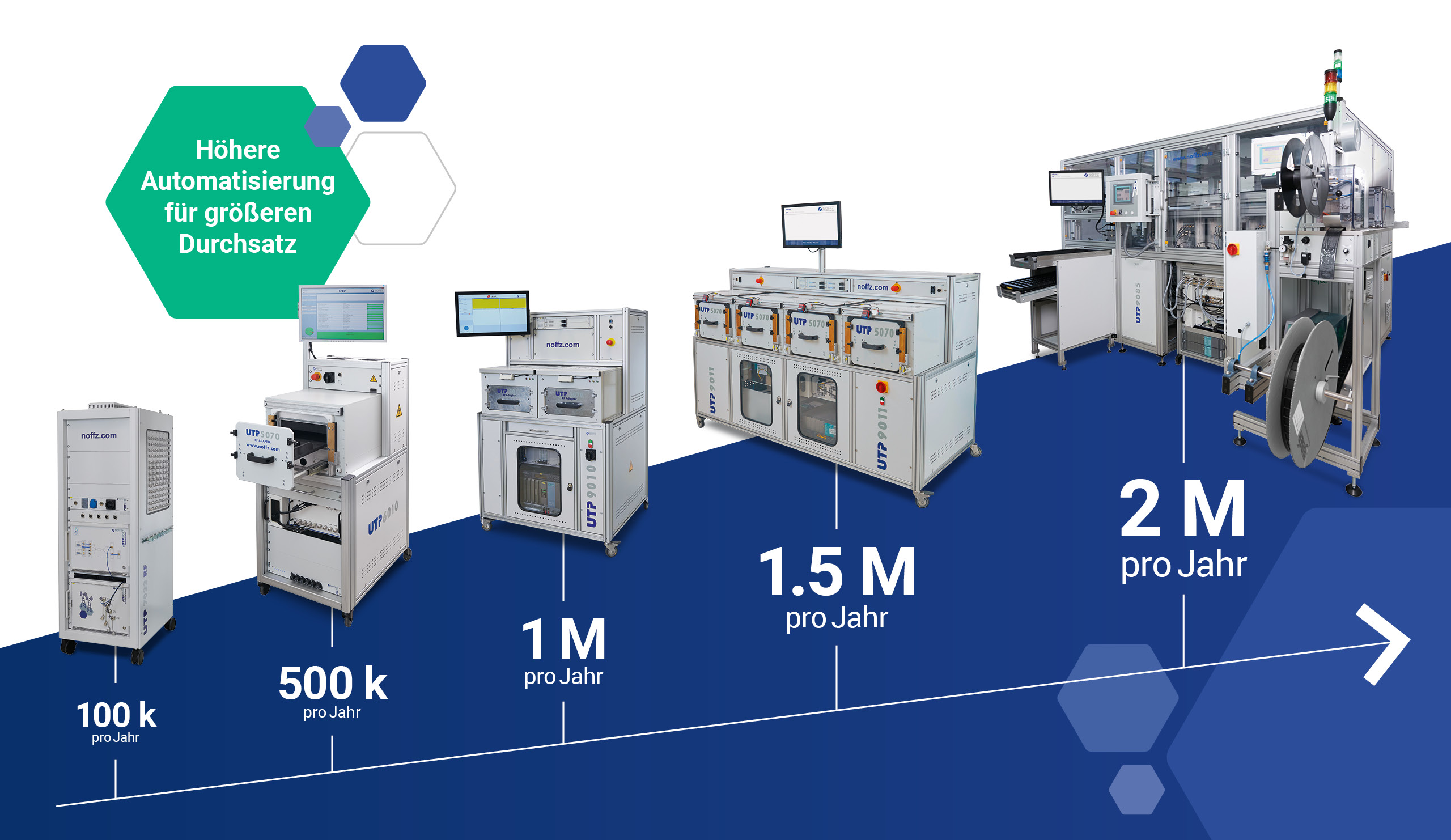 Wir konzipieren unter anderem langlebige Gesamtsysteme, Einzeltester, Komponenten oder auch komplette Automatisierungslösungen für Sie. Unsere skalierbare UTP Plattform wächst dabei mit Ihren Anforderungen. Steigern Sie Ihr Produktionsvolumen!