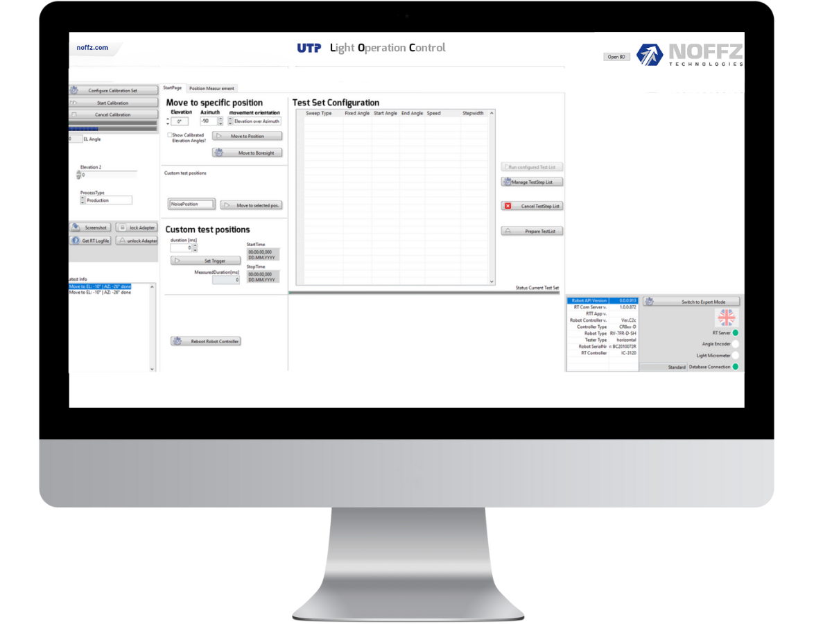 - Messungen und Kalibrierung werden bei hochgenauen Bewegungen des Prüflings auf zwei Achsen (Azimut und Elevation) realisiert